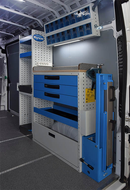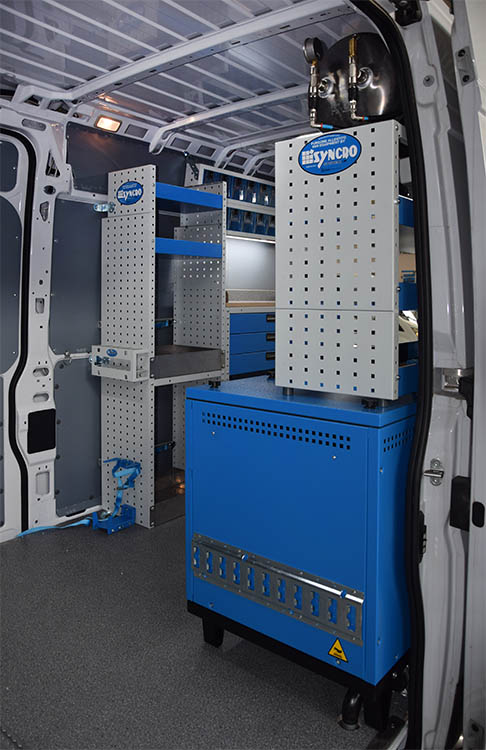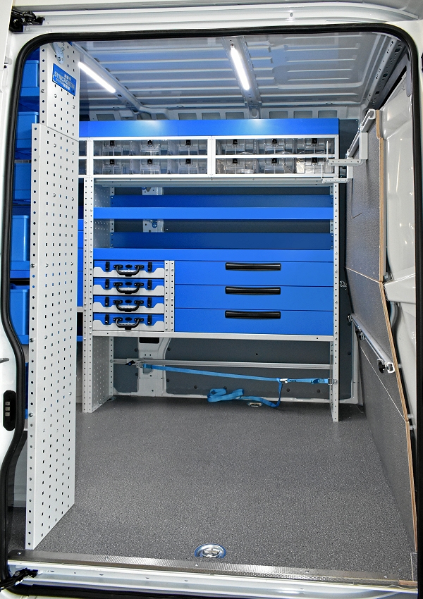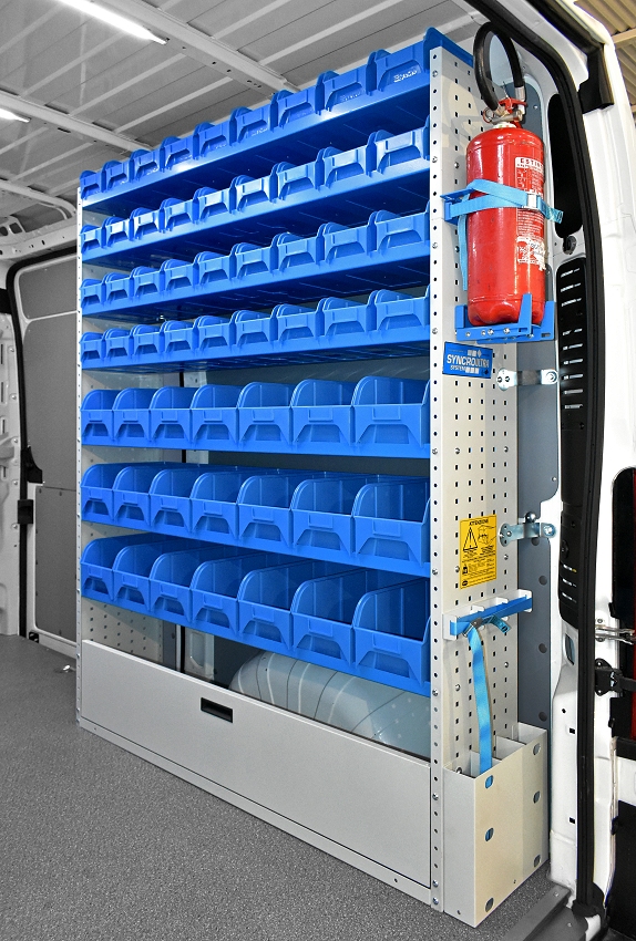 En caso de necesitar mucho espacio central para cargar materiales y mercancías, es posible equipar con muebles Syncro System sólo una de las paredes laterales, o incluso sólo la mampara de fondo. No hay nada que se establezca a priori. Según las necesidades del cliente, los técnicos de Syncro Chile elaboran un proyecto de equipamiento del Fiat Ducato a medida. Aquí arriba un ejemplo de taller móvil en Ducato con ambas paredes amuebladas. Nótese, a la derecha, la serie repisas de arriba abajo con contenedores extraíbles en plástico.