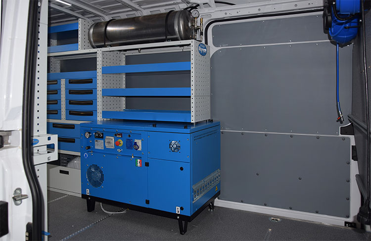 En este Ducato los accesorios desarrollan un papel muy importante para la funcionalidad de la furgoneta: además del clásico kit lavamanos, vemos una abrazadera en un porta abrazadera abatible, una luz de LED que ilumina una superficie de trabajo, una serie de barras con ganchos y también un elemento importantísimo para garantizar la autonomía operativa incluso fuera del establecimiento: una máquina combinada generador compresor conectada a dos bobinadores.