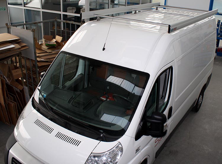 Syncro System tiene además en su catálogo una amplia gama de sistemas de transporte en el techo del Ducato: porta todo, porta escalera, porta paquetes en acero y aluminio, con parapetos laterales y rodillo posterior para favorecer la carga y descarga de los equipos con menos esfuerzo y menos riesgos.