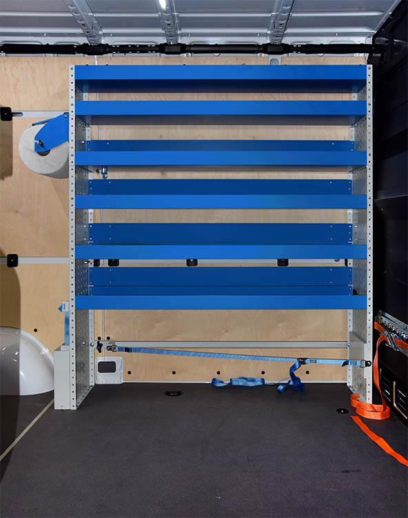 En este caso vemos un equipamiento con muebles por ambas paredes y varios sistemas de fijación en el separador de carga, en la pared izquierda y en el mobiliario de la derecha.