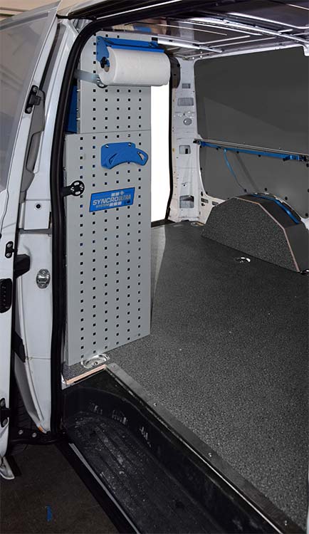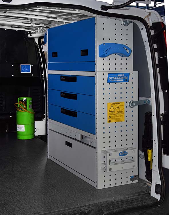 La modularidad del sistema Syncro Ultra permite dar vida a soluciones de decoración siempre distintas y totalmente a medida. En las imágenes de aquí arriba, por ejemplo, vemos cómo el Mercedes Benz Vito ha sido equipado sólo por un lado y ha conservado muchísimo espacio libre para el almacenaje de mercancías y herramientas. El mobiliario, concentrado en la pared derecha, está completado a la izquierda con sistemas de bloqueo de la carga con barra metálica y correa.