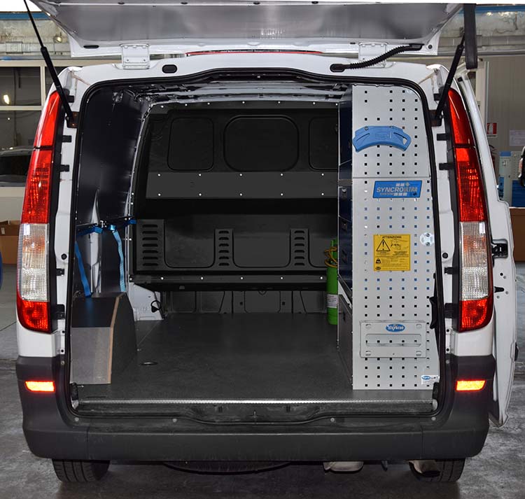 Disponible con dos pasos distintos, tres longitudes y dos alturas, brillante en las prestaciones, fiable en la carretera y, sobre todo, fácilmente equipable. El Mercedes Vito es un vehículo comercial de medianas dimensiones fabricado desde 1996 en los establecimientos españoles de Vitoria y desde su aparición en el mercado ha sido estudiado por los expertos sin que los sistemas para poder ser equipado y acceso liado con los equipamientos ad hoc, parados en base a las necesidades de sus propietarios. Completamente modernizado en 2003, el medio se presenta de hecho para ser utilizado en distintas formas por artesanos fontaneros electricistas instaladores técnicos y por todos los trabajadores que, para desarrollar su actividad, tienen que desplazarse continuamente de una obra a otra tiene un cliente a otro. El Vito, que su versión más grande puede llegar hasta un volumen de 7,4 m³, puede por tanto contar con una línea compacta de módulos de accesorios de equipamiento Syncro System a medida: suelos, revestimientos,cajoneras, estanterías, repisas y contenedores diseñados y creados para ser introducidos, en 1000 combinaciones distintas, dentro de la zona de carga de la pequeña furgoneta Mercedes y para organizar lo mejor posible cada centímetro cuadrado disponible.