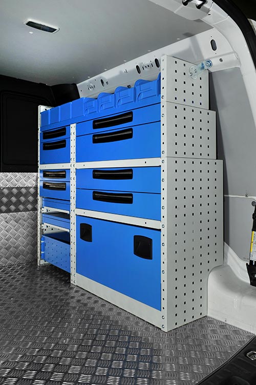 Entre las distintas soluciones de mobiliario para el Volkswagen Caddy, Syncro Chile propone también equipamientos parciales, que ocupan sólo un lado del receptáculo, dejando libre una zona para la carga. Aquí vemos la foto de un Caddy con suelo y el separador de carga en damero y equipamiento sólo por el lado derecho. El mobiliario está formado por varios cajones y portamaletines metálicos, algunos de los cuales se abren hacia fuera por la puerta lateral. El Caddy puede equiparse también por ambos lados o ser accesoriado con una cajonera infraplataforma, según las necesidades del cliente.