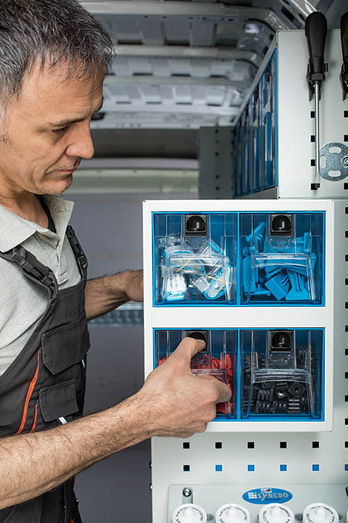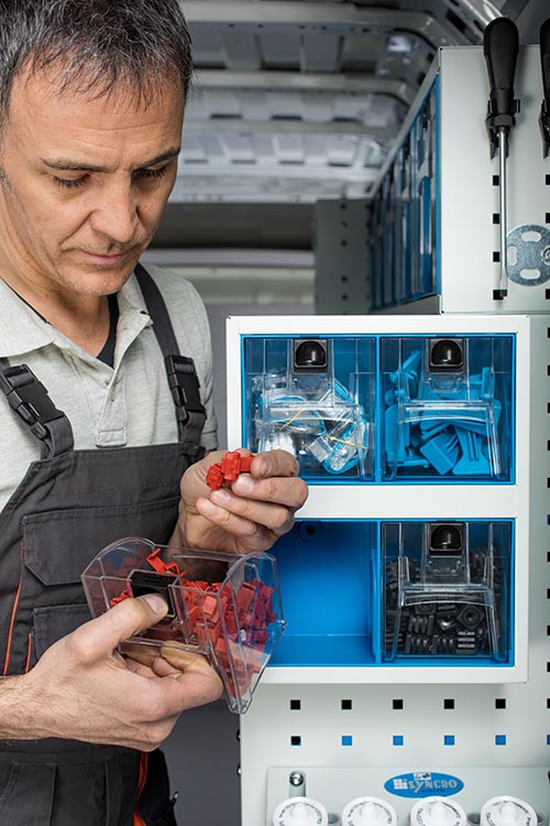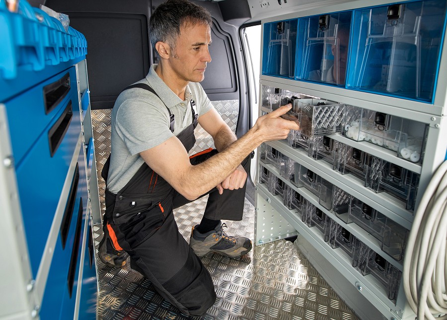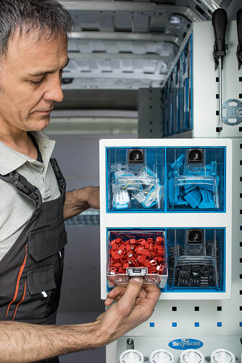 Desde el punto de vista de la organización funcional de la furgoneta, poder contar con contenedores de plástico transparente permite tener siempre visible todo el material a disposición, reduciendo las pérdidas de tiempo y el riesgo de que falte algo justo en el momento en que se necesita.