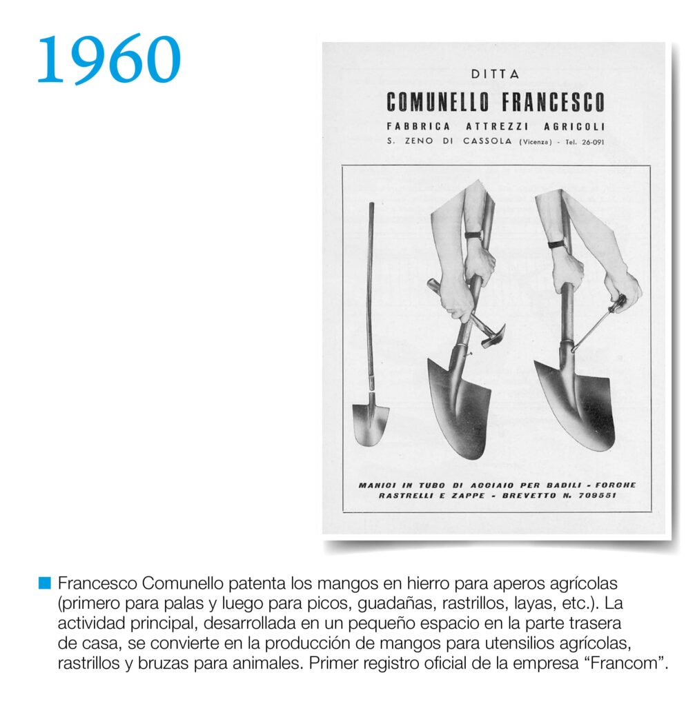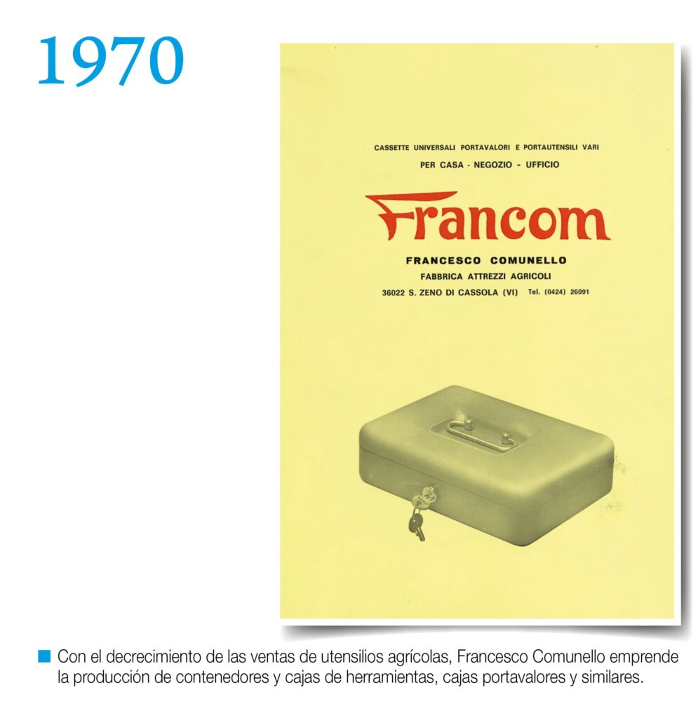 En 2025, Francom Spa cumple 65 años: la empresa celebra este importante aniversario con la publicación de un pequeño volumen en el que recorre las principales etapas de su historia, con palabras, pero sobre todo con imágenes significativas. Desde los años anteriores a 1960, fecha del primer registro con el nombre actual de la actividad de producción de herramientas para la agricultura por parte de Francesco Comunello, hasta 2020. En el medio, muchos eventos que han llevado a la empresa hacia la configuración actual.